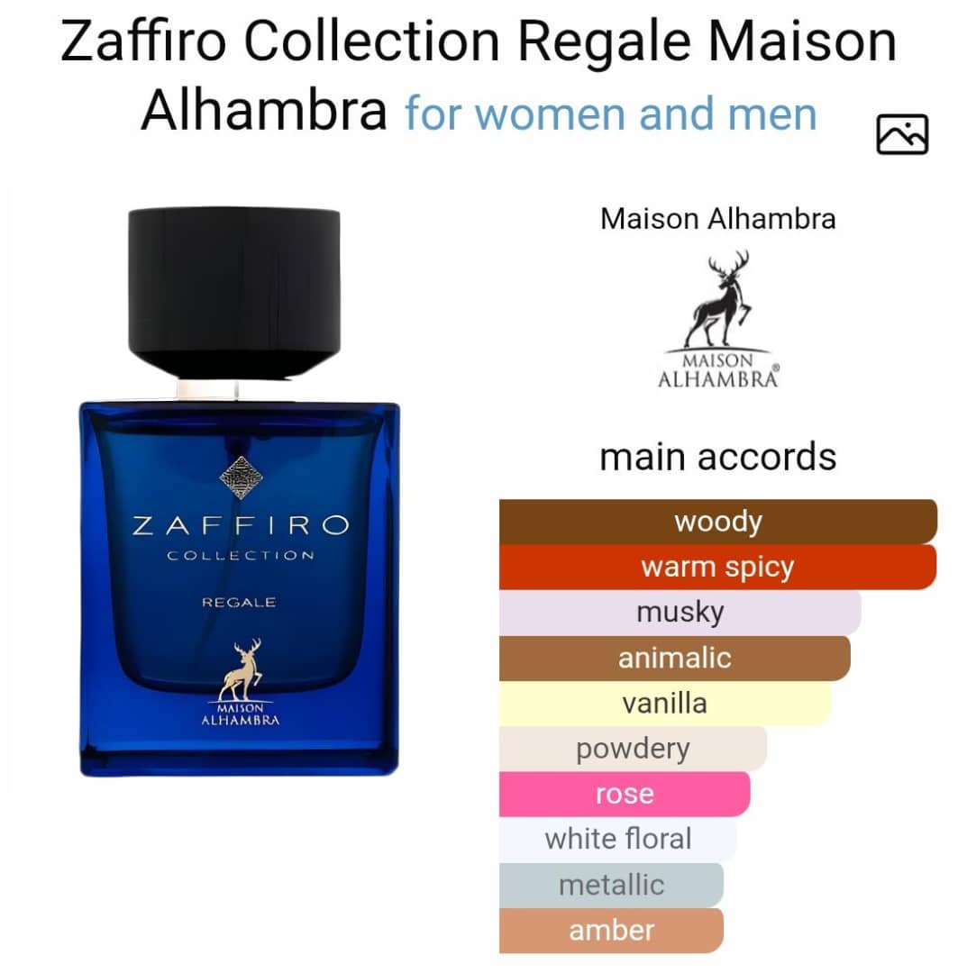 Zaffiro Collection Regale by Maison Alhambra is a Oriental fragrance for women and men. Top note is Lemon; middle notes are Saffron, Rose, Cardamom and Jasmine; base notes are Animal notes, Vanilla, Cedar, Gurjan balsam, Labdanum, Musk and Patchouli.