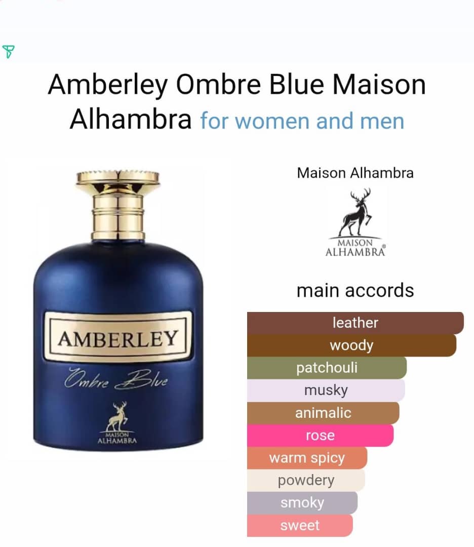 Amberley Ombre Blue by Maison Alhambra is a Woody Aromatic fragrance for women and men. Top notes are Pink Pepper, Fig and Black Pepper; middle notes are Patchouli, Turkish Rose and Cedarwood; base notes