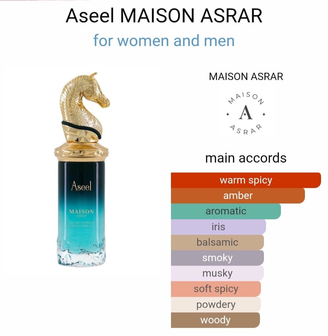 Aseel by Maison Asrar is described as a fougère-ambery composition that combines aromatic freshness with warm, resinous depth. The fragrance opens with a lively blend of cardamom, lemon, incense, pink pepper, tea, and juniper berry. A floral heart of orris, lily of the valley, rose, and jasmine softens the structure and adds a powdery and gently green nuance. In the base, musk, oud, tonka bean, cashmere notes, ambergris, and patchouli provide a lasting, textured drydown that balances woody, musky, and ambery facets.