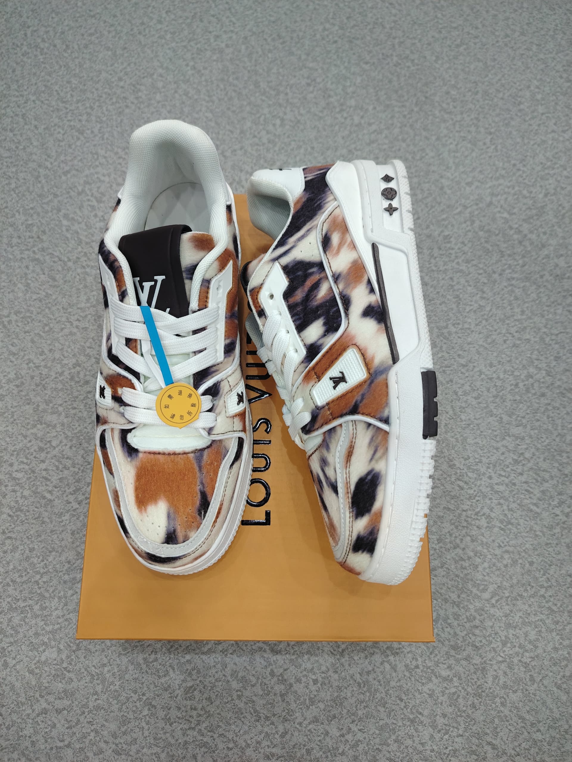 The silhouette is bold and structured, with a cushioned high-top collar and sculpted outsole that delivers both presence and performance. Metallic hardware details, textured panels, and a color-blocked sole add dynamic contrast, making it a standout in any wardrobe. Whether paired with designer denim or upscale athleisure, the Bold & Luxury LV Sneaker exudes confidence, exclusivity, and refined attitude.