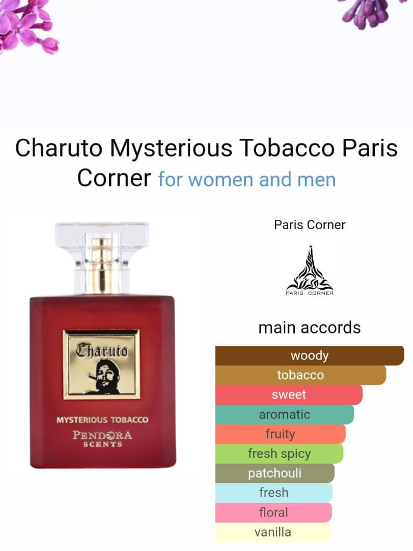Charuto Mysterious Tobacco Perfume by Paris Corner is a Aromatic fragrance for women and men. Top notes are Osmanthus, Ginger, Citruses and Artemisia; middle notes are Tobacco, Guaiac Wood, Patchouli and Vetiver; base note is Tonka Bean.
