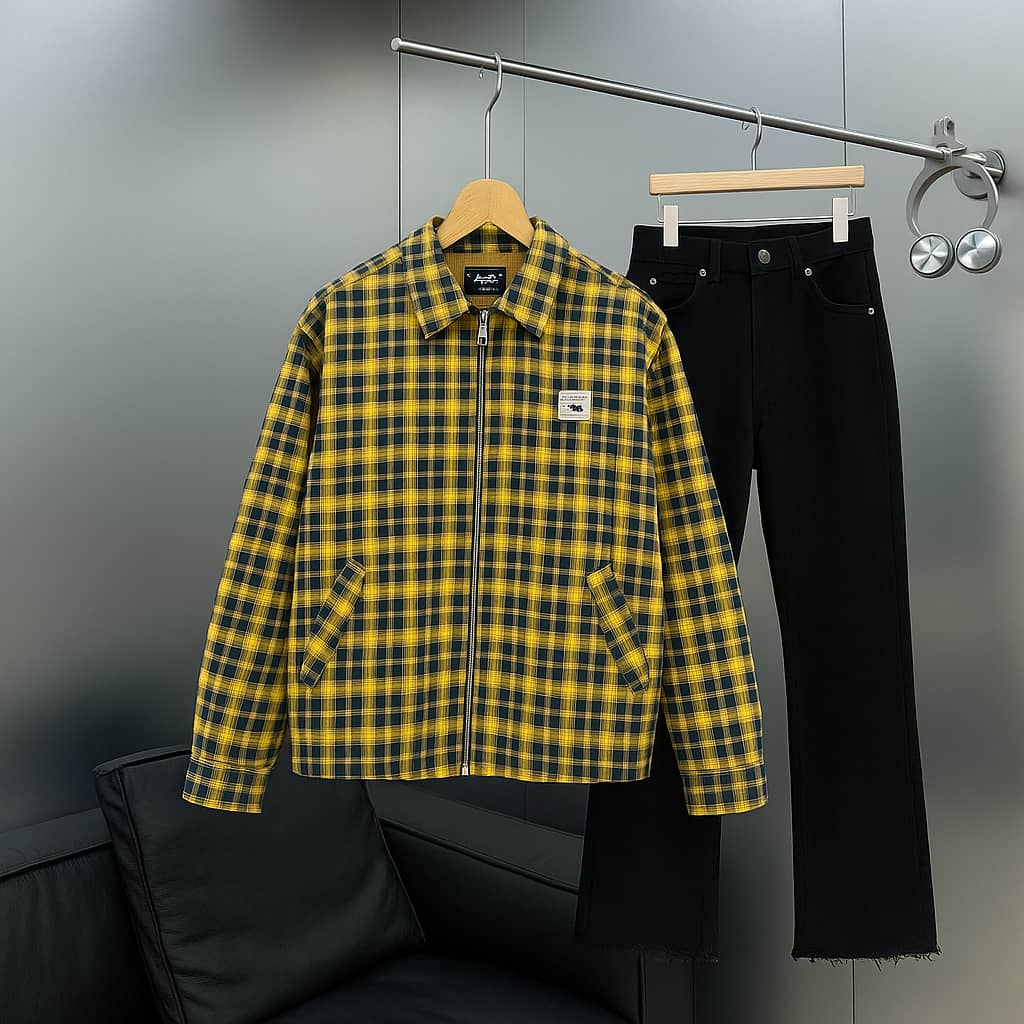 Step out in timeless style with this Classic Men Jacket & Black Denim Set, designed for men who appreciate a blend of comfort, confidence, and trend. The outfit pairs a striking yellow-and-black plaid jacket with a sleek black denim trouser — a combination that exudes effortless charm.