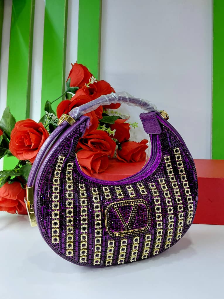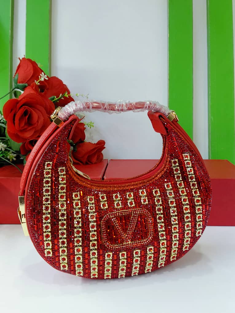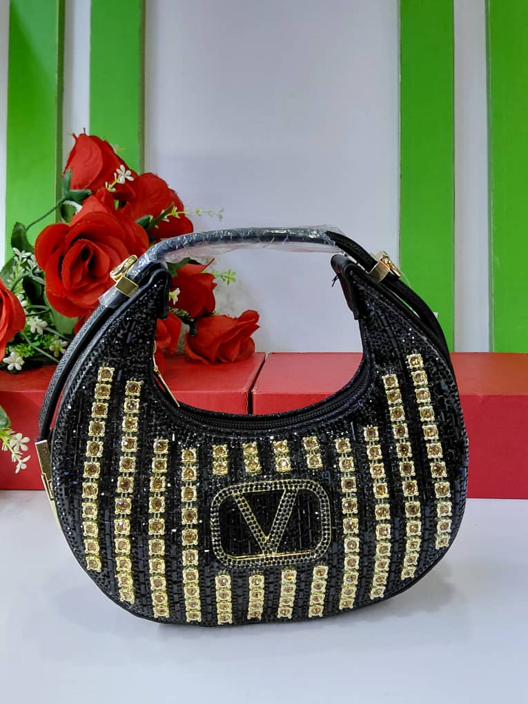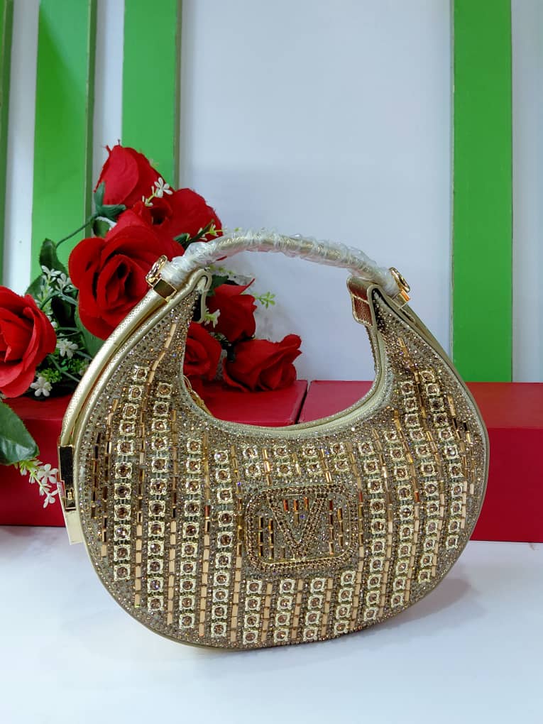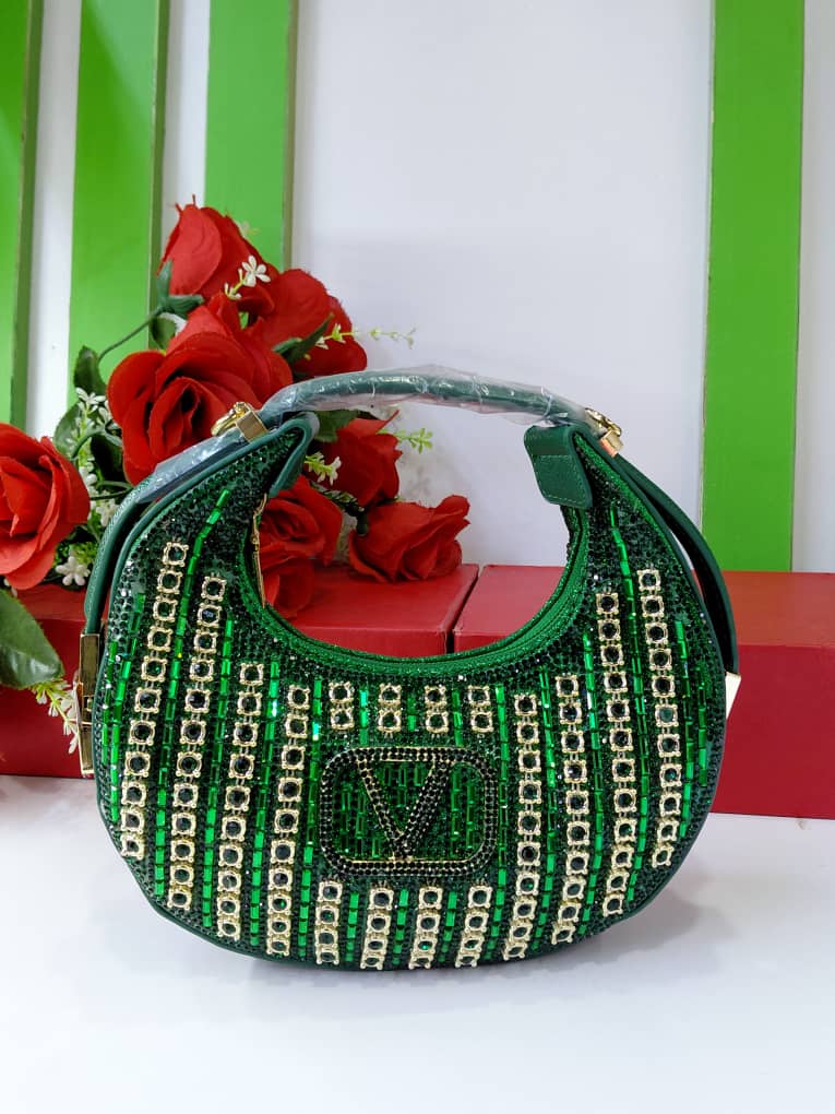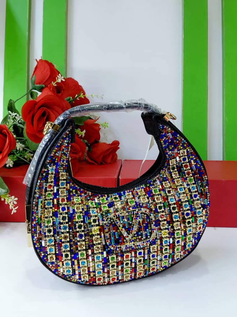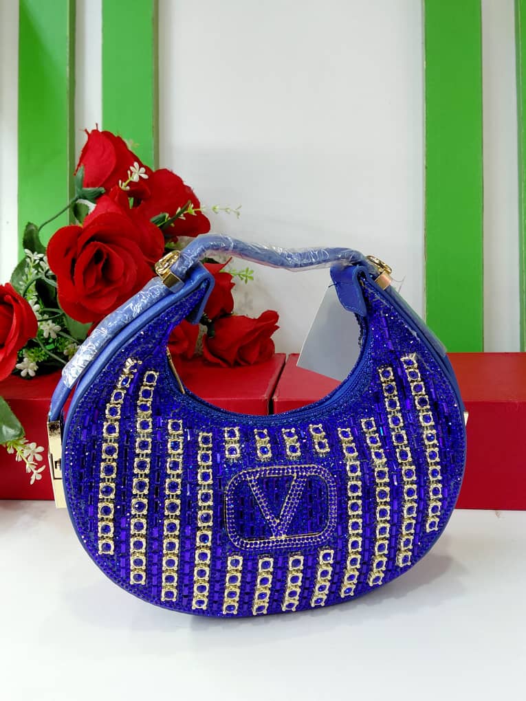 Available in a vibrant palette — from royal blue, emerald green, rich red, multicolor, gold, and classic black and purple— these bags are your go-to accessory for parties, weddings, and night outs. The bold “V” emblem adds a chic designer-inspired touch, while the firm top handle ensures both style and ease of carry.