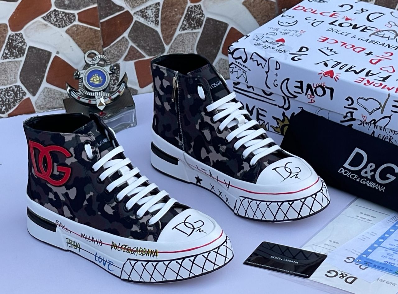 Step into the spotlight with these eye-catching Dolce & Gabbana high-tops Sneakers, where streetwear meets Italian sophistication. Crafted in a striking dark camouflage print, the shoes feature bold red “DG” appliqué branding on the outer ankle for a powerful visual impact. The canvas upper is balanced with a sturdy rubber sole adorned with playful doodles, graffiti-style inscriptions, and hand-drawn motifs, including the words “LOVE,” “MILANO,” and “Dolce&Gabbana.”