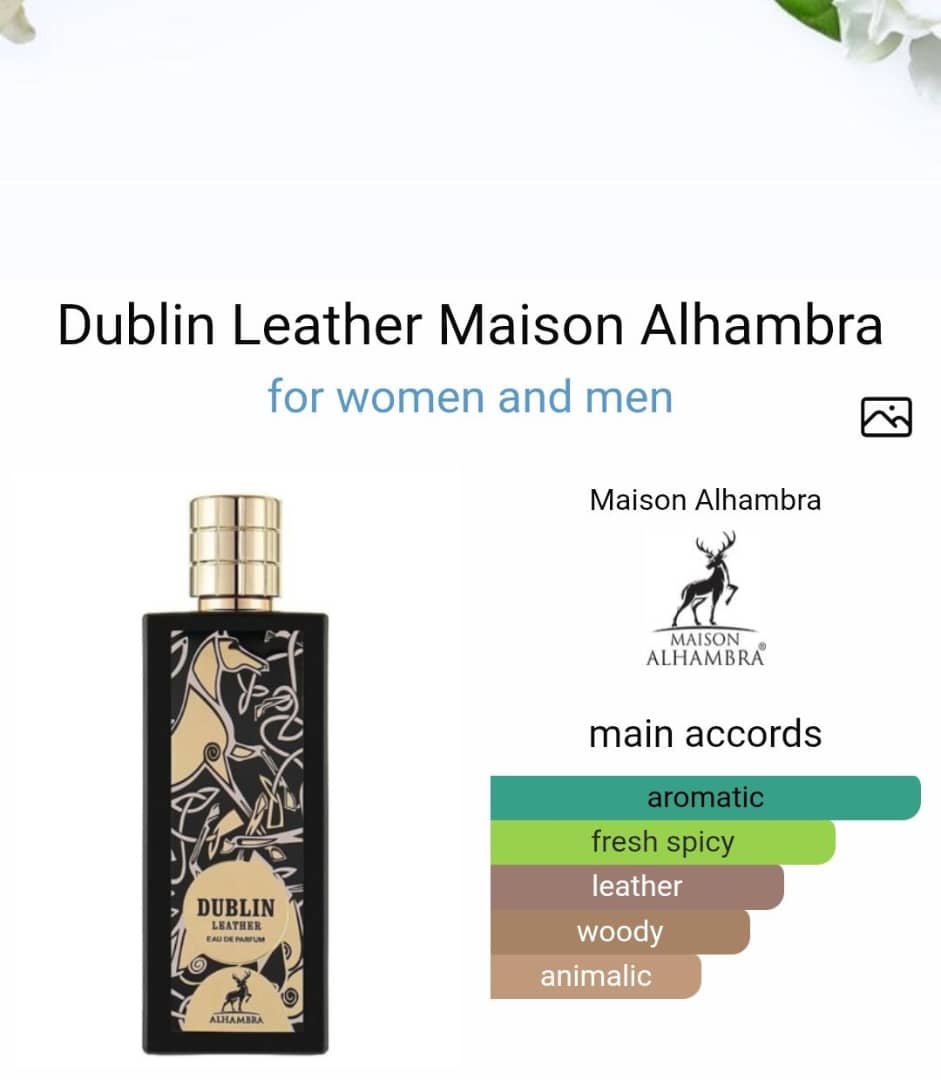 Dublin Leather Perfume by Maison Alhambra is a Leather fragrance for women and men. Dublin Leather was launched in 2022. Top notes are Juniper Berries and Leather; middle notes are Mate and Amber; base note is Tonka Bean.