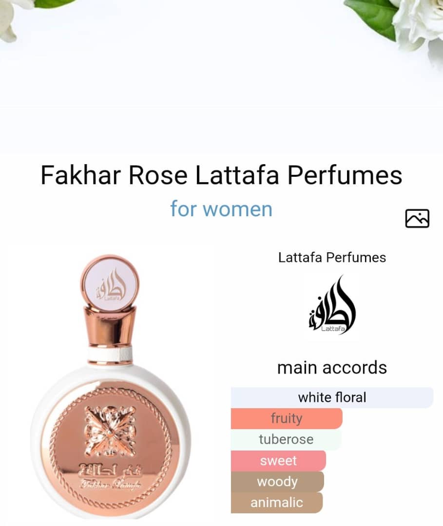 Fakhar Rose by Lattafa Perfumes is a Floral fragrance for women. Top notes are Fruits, Lily, Pomegranate and Aldehydes; middle notes are Tuberose, Jasmine, Gardenia, Ylang-Ylang, Honeysuckle, Rose and Peony; base notes are Vanilla, White Musk, Sandalwood and Ambroxan.