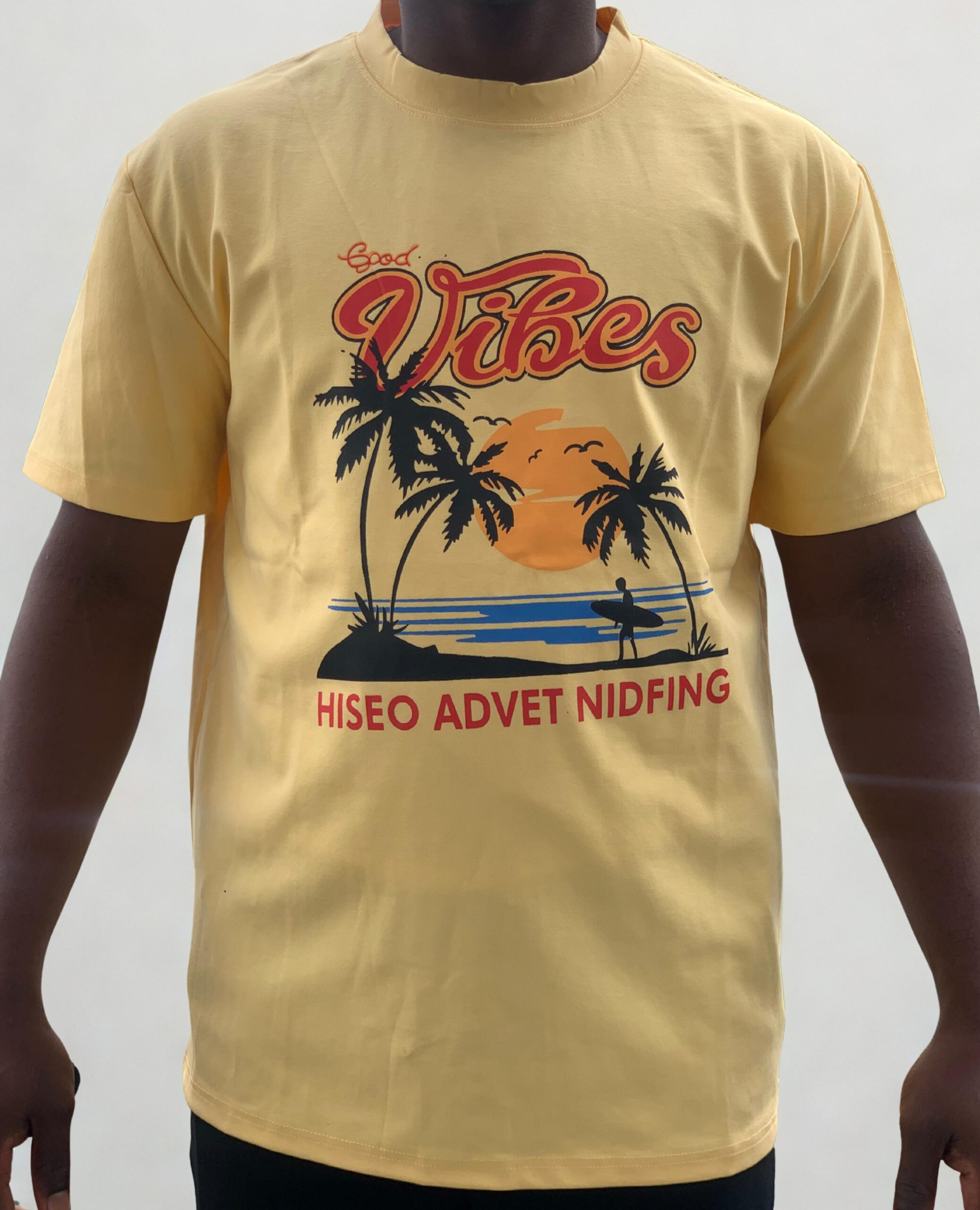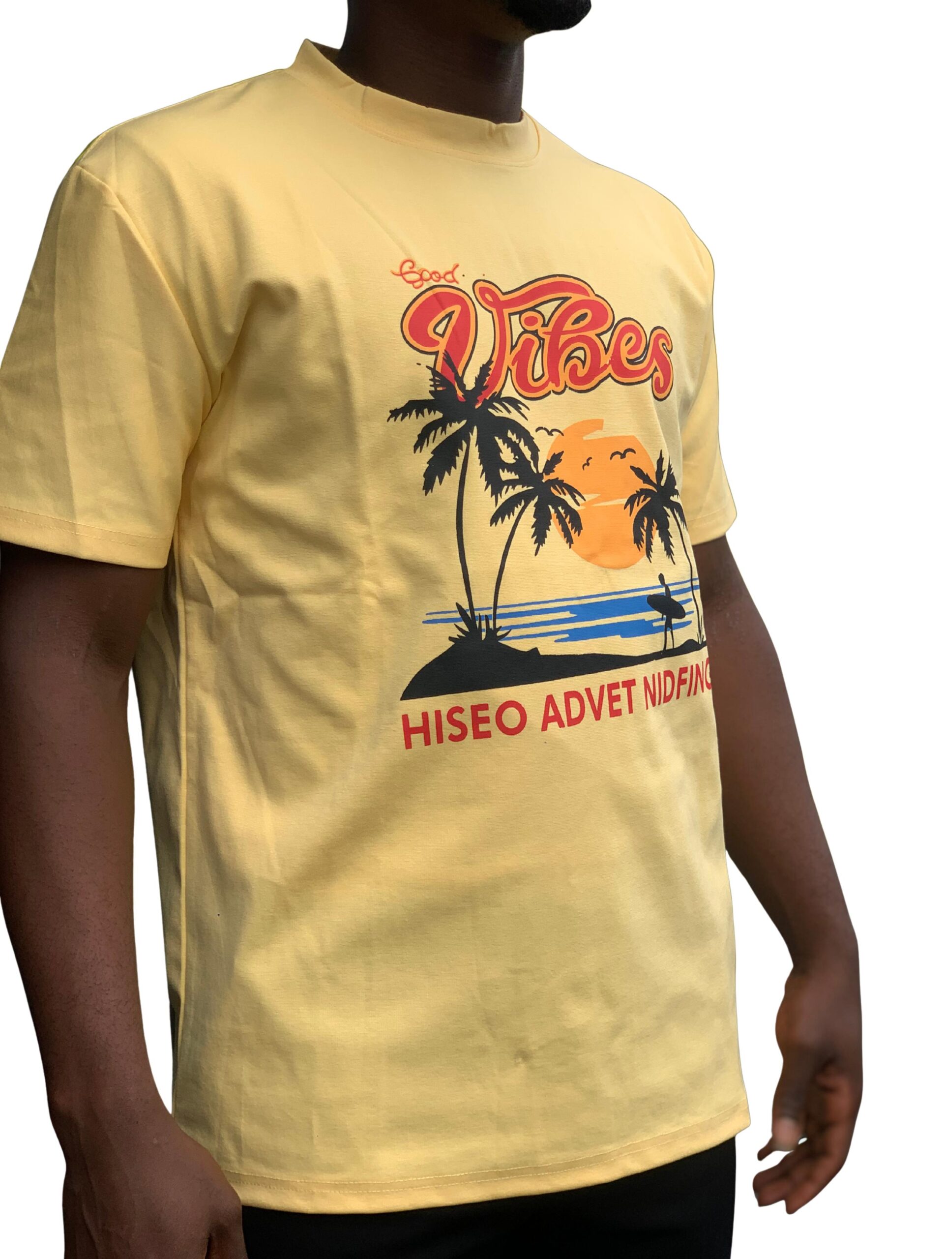 Bring the beach to your wardrobe with the Good Vibes Sunset Tee, a cheerful and tropical-inspired T-shirt designed to radiate positivity. Set against a soft yellow background, the design features a scenic sunset with palm trees, birds in flight, and a silhouette of a surfer heading toward the waves. The bold “Good Vibes” lettering at the top sets the tone, while the playful and abstract phrase “HISEO ADVET NIDFING” adds a quirky, laid-back twist.