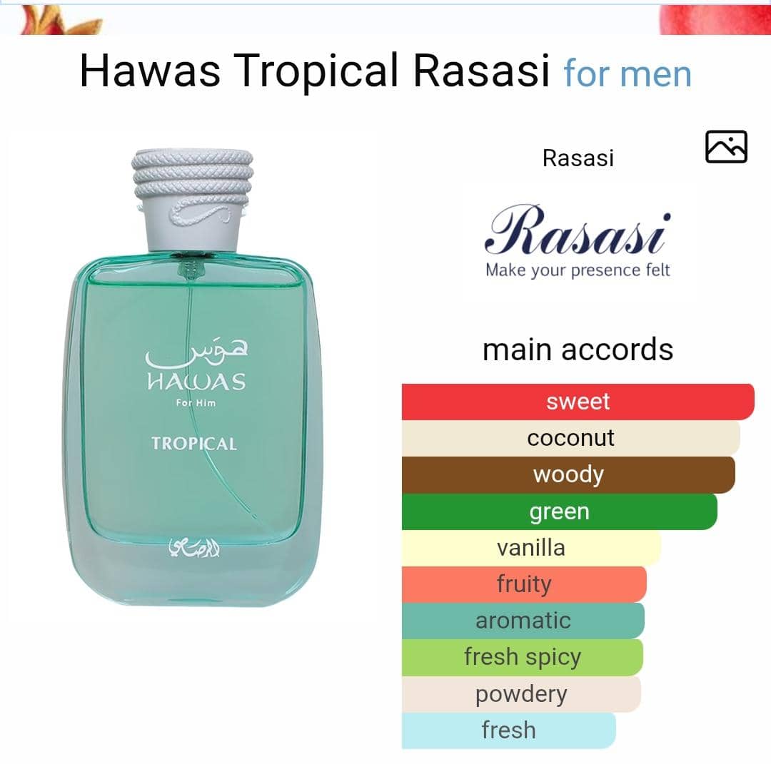 Hawas Tropical Perfume by Rasasi is a Aromatic Green fragrance for men. [2025 fragrance]