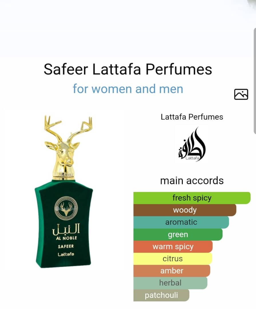 Safeer by Lattafa Perfumes is a fragrance for women and men. Top notes are Bergamot and Artemisia; middle notes are Herbal Notes, Green Notes and Spicy Notes; base notes are Guaiac Wood, Frankincense, Juniper, Patchouli, Cumin, Nutty Notes and Labdanum.