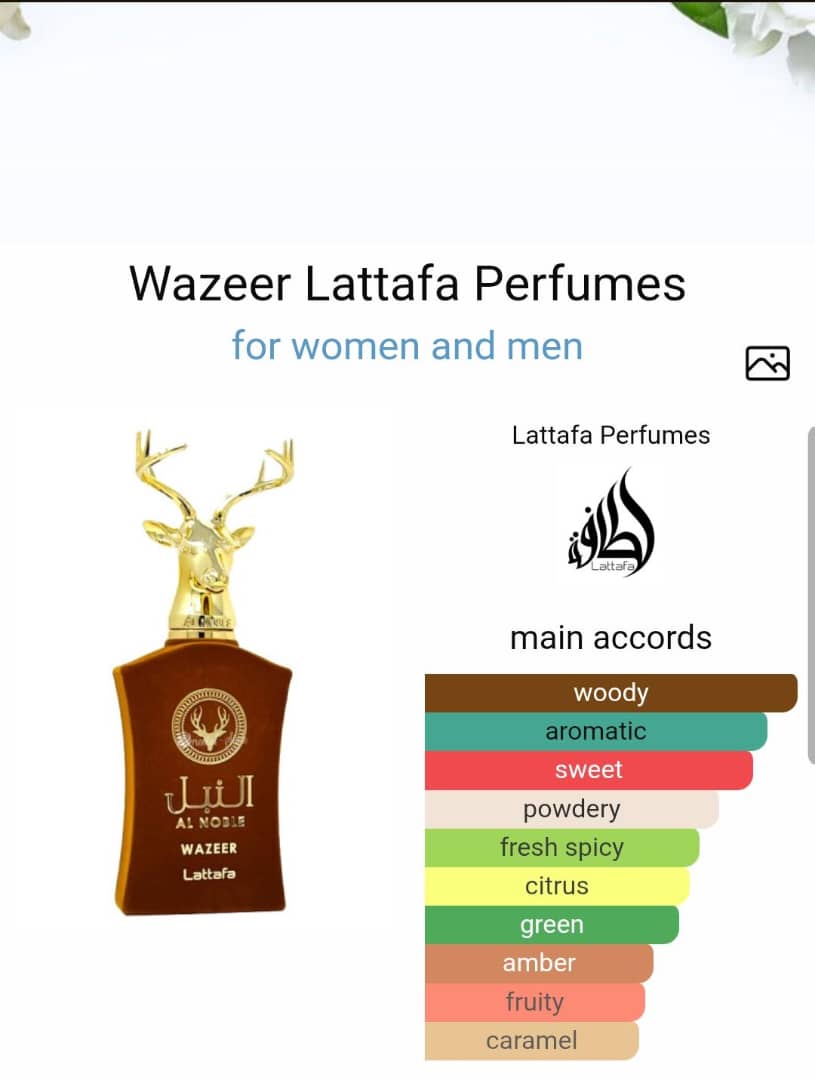 Wazeer by Lattafa Perfumes is a fragrance for women and men. Top notes are Mint, Orange, Juniper and Bergamot; middle notes are Chocolate, Caramel, Pear, Iris and Raspberry; base notes are Amber, Vanilla, Sandalwood, Cedar, Musk and Vetiver.
