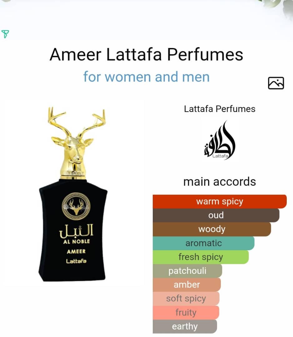Ameer by Lattafa Perfumes is a fragrance for women and men. Top notes are Pink Pepper, Apple and Rosemary; middle notes are Cloves and Floral Notes; base notes are Oud, Patchouli, Labdanum, Cypress and Vetiver.