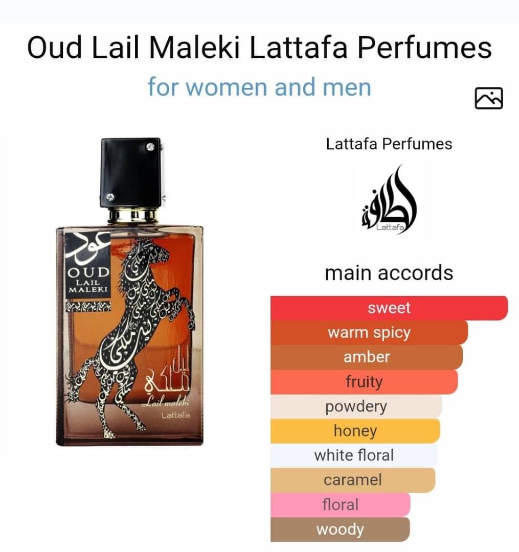 Oud Lail Maleki by Lattafa Perfumes is a fragrance for women and men. Top notes are Spices, Fruits and Citruses; middle notes are Honey, Jasmine, Orchid and Gardenia; base notes are Amber, Caramel, Sandalwood and Musk.