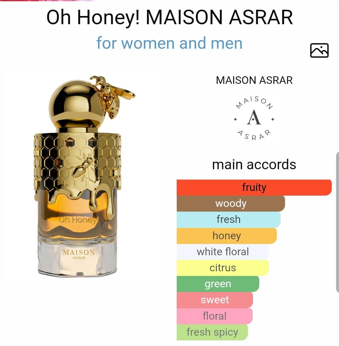 Oh Honey ! by Maison Asrar is a fruity sweet fragrance. The composition opens with blackcurrant, spicy apple, and citrus, leading to a heart of white florals, honey, and cedar. The base features sandalwood, vanilla, and orcanox, creating a sweet yet bold scent profile.