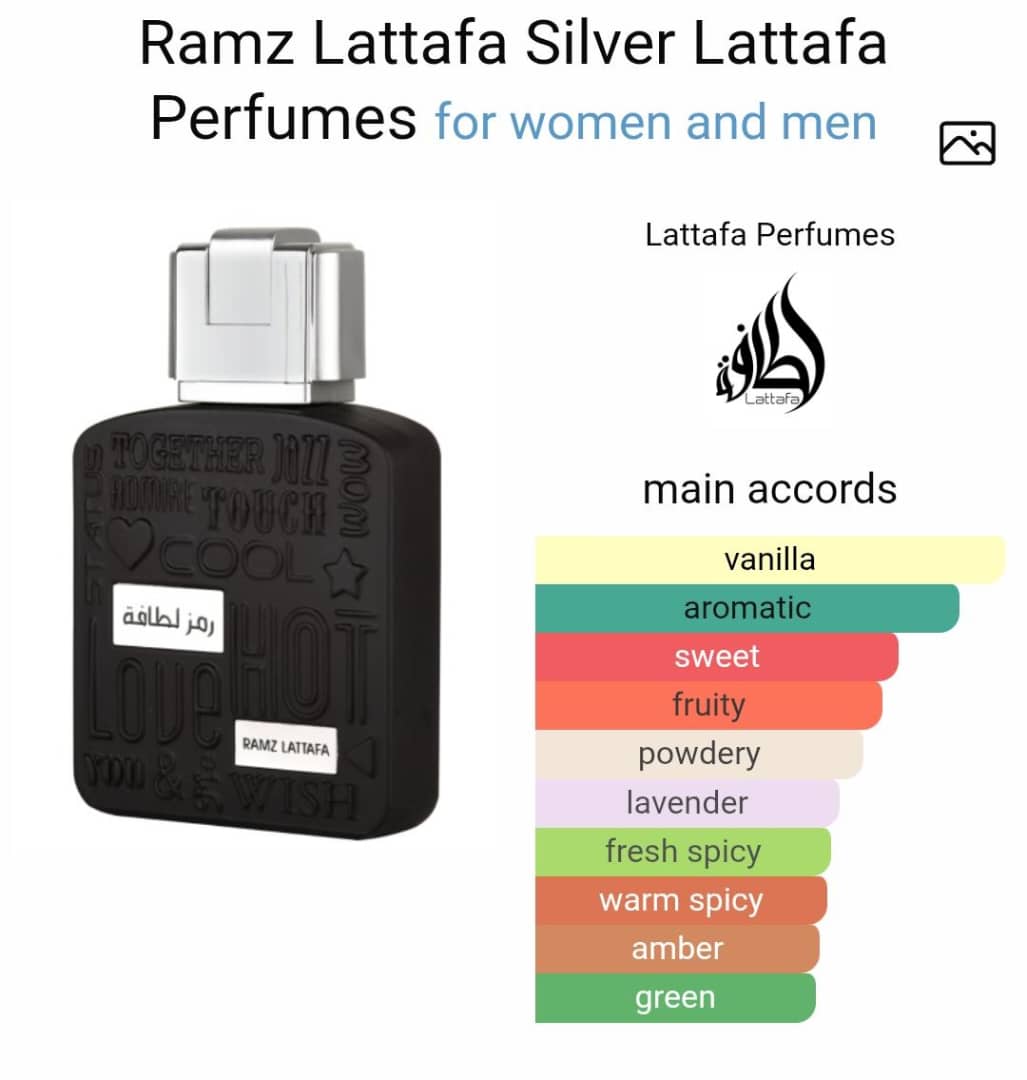 Ramz Lattafa Silver by Lattafa Perfumes is a Oriental Vanilla fragrance for women and men. Top notes are Pear, Lavender, Bergamot and Mint; middle notes are Cardamom and Sage; base notes are Vanilla, Amber, Musk and Patchouli.