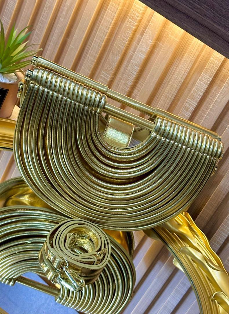 Make a bold style statement with the Sculpted Luxe Arc Bag – a show-stopping blend of artistry and elegance. Crafted in a rich, jet-black finish, this semi-circular handbag features a distinctive ribbed design that creates a striking layered effect, reminiscent of modern architectural lines. Its sturdy tubular top handles, accented with gold-tone end caps, add a touch of sophistication and structure, while the detachable leather strap offers versatile wear as a crossbody or shoulder bag.