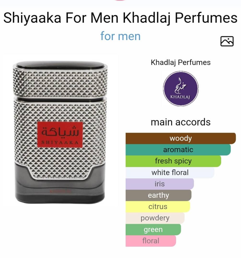 Shiyaaka For Men by Khadlaj Perfumes is a fragrance for men. Top notes are Rosemary, Petitgrain and Pepper; middle notes are Neroli, Orris and Jasmine; base notes are Cedar, Vetiver and Patchouli.