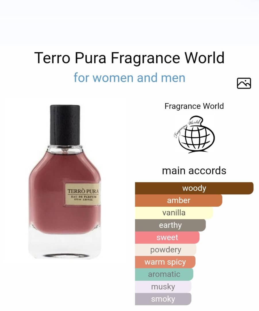 Terro Pura Perfume by Fragrance World is a fragrance for women and men. Top note is Raspberry; middle notes are Benzoin, Amber and Birch; base notes are Guaiac Wood, Patchouli, Vanilla, Vetiver, Cedar, Tonka, Musk and Moss
