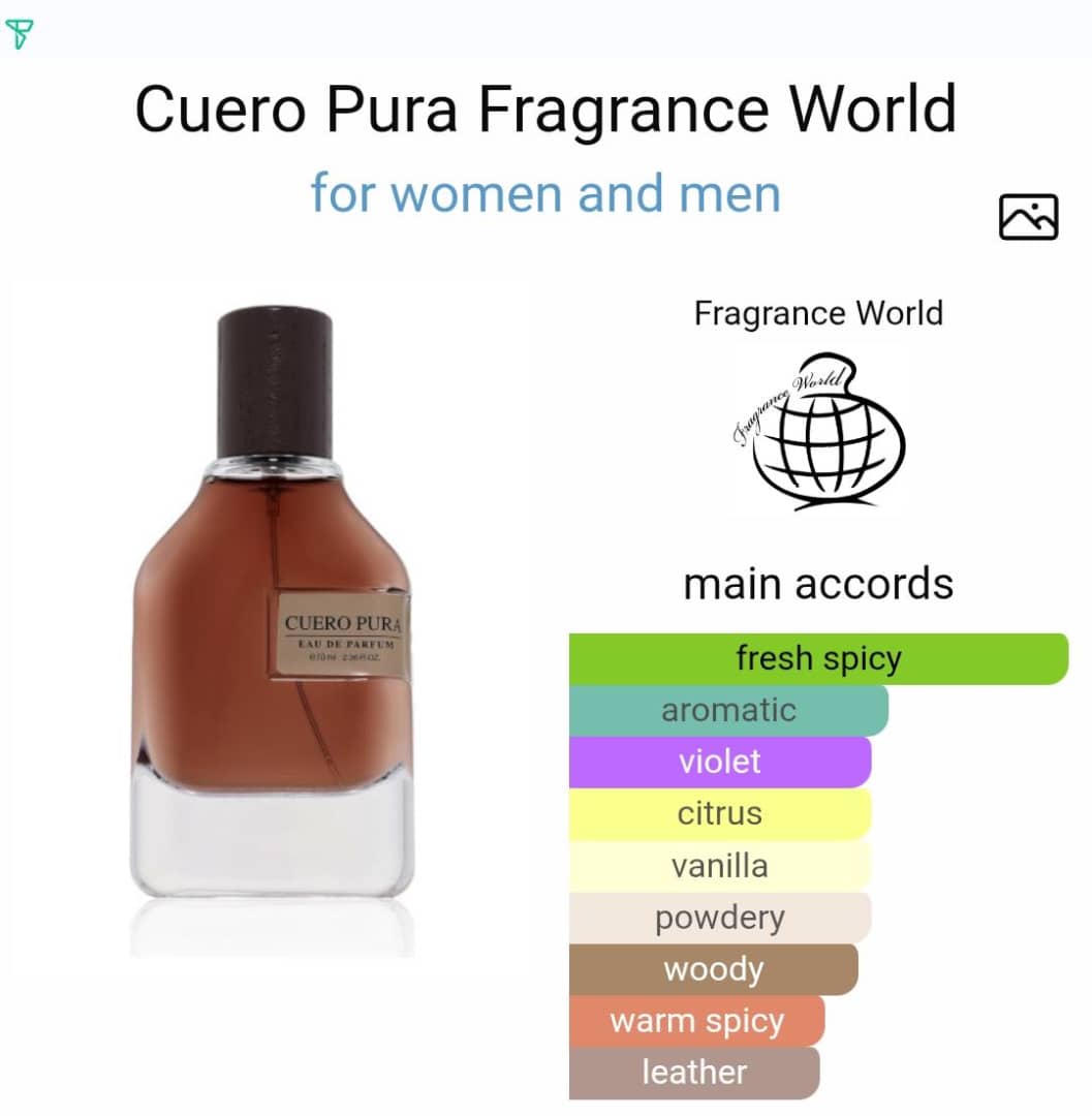 Cuero Pura Perfume by Fragrance World is a unisex fragrance with prominent leather accord blended with incense and oriental vanillas. The composition opens with fresh citrus and spice notes before transitioning to smoky, animalic undertones. Amber and balsamic elements in the base.