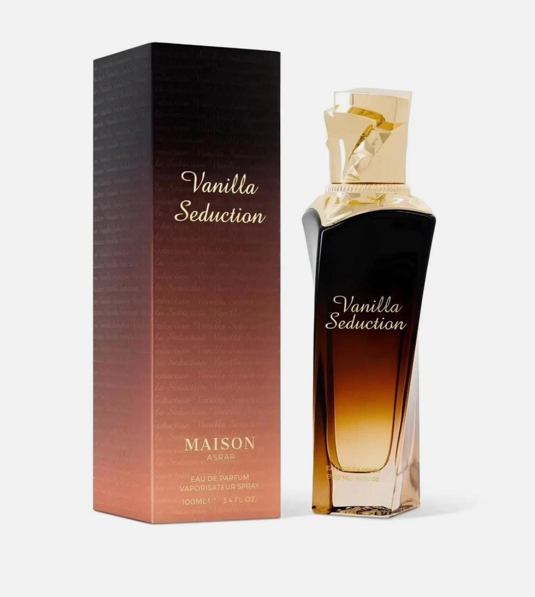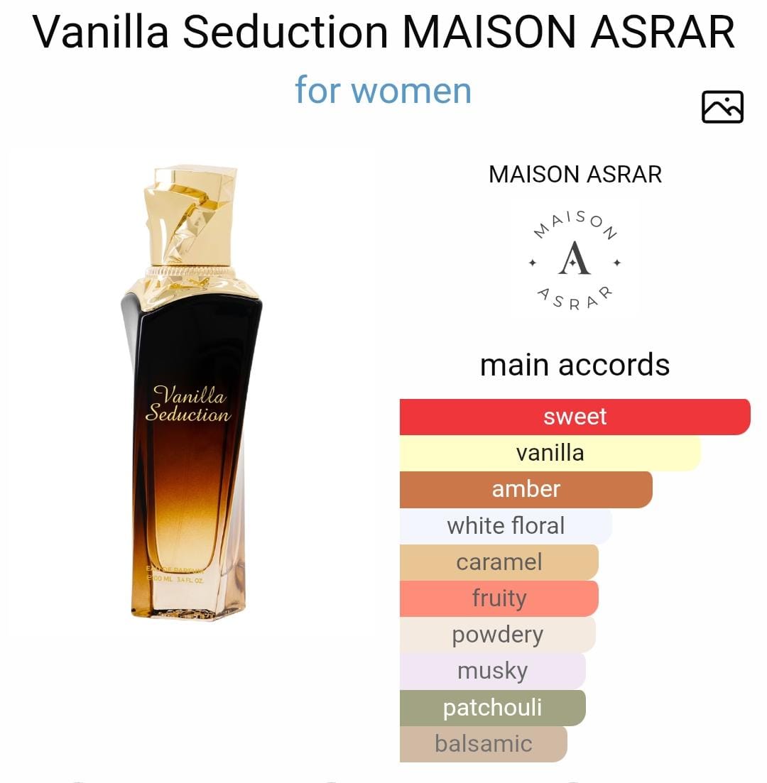 Vanilla Seduction by Maison Asrar is a gourmand-leaning fragrance. It opens with plum, lily of the valley, and jasmine, moves into a heart of vanilla, brown sugar, and caramel, and settles into a warm base of tonka, musk, amber, and patchouli. The composition highlights creamy vanilla and sugary facets balanced by fruit and florals, finishing with an amber-musk drydown.