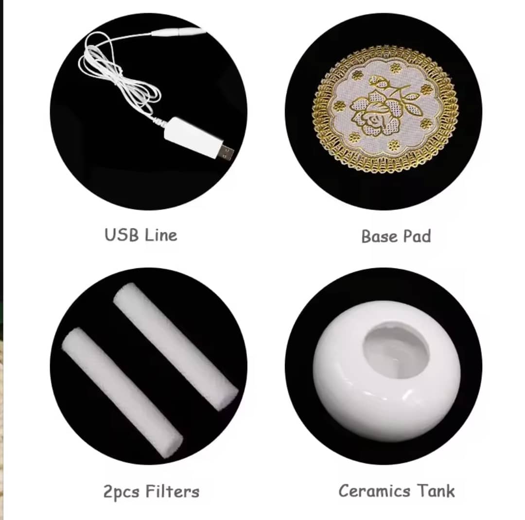 Components: 1 Piece Humidifier, 1 Piece Usb Cable, 1 Piece Coaster, 1 Piece Manual, 2 Pieces Filter Elements