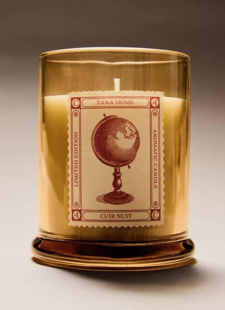 Zara Cuir Nuit scented candle | This fragrance emerges on a luminous bergamot note, which blends perfectly with the vitality of the spicy notes of pepper. The subtlety of peony and the sumptuousness of iris intertwine, leaving a trace of sensuality. The leather notes are mixed with patchouli and vetiver, adding a touch of irresistible elegance.